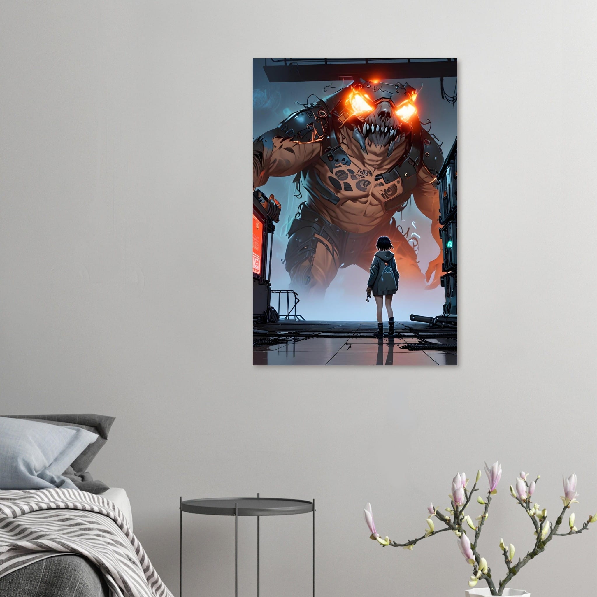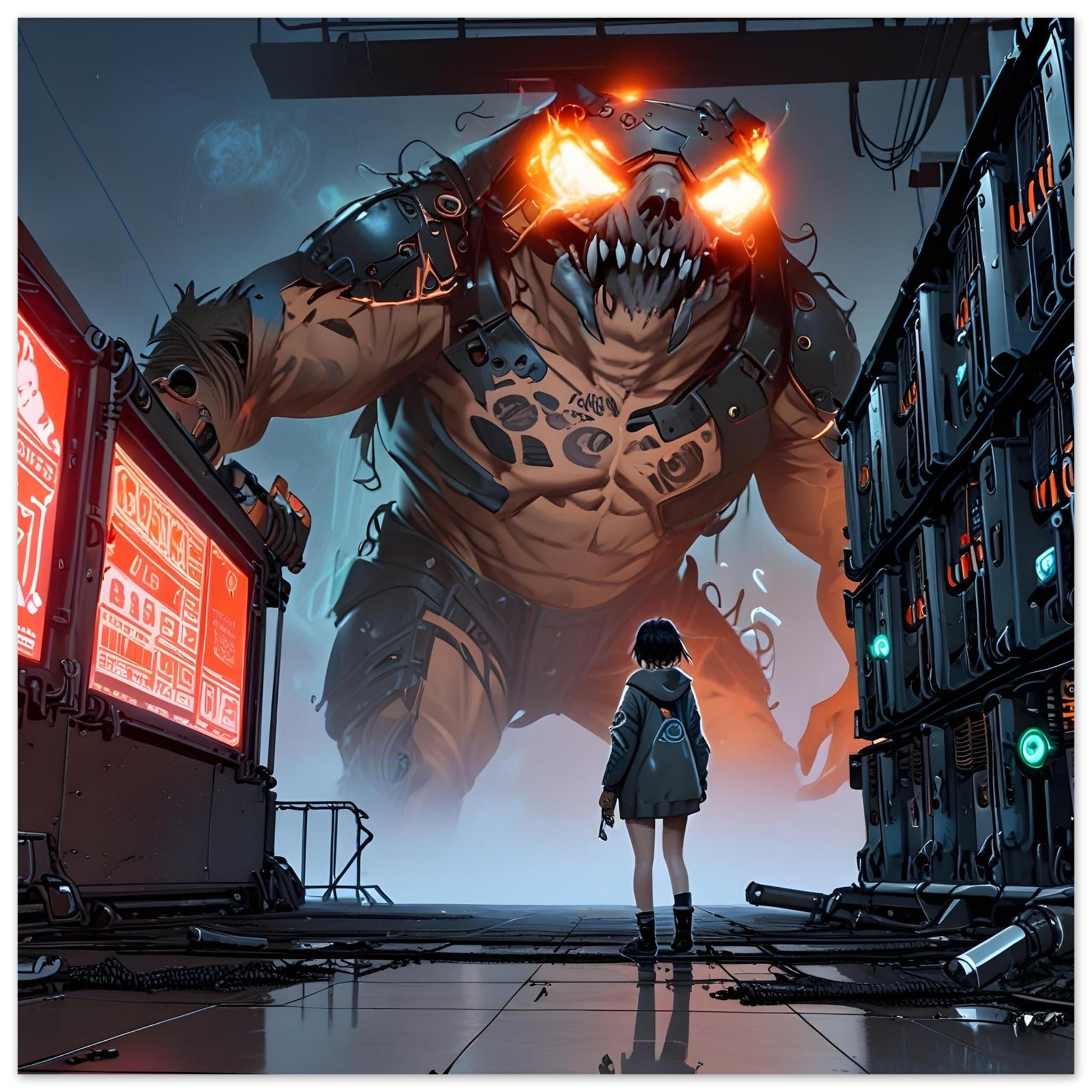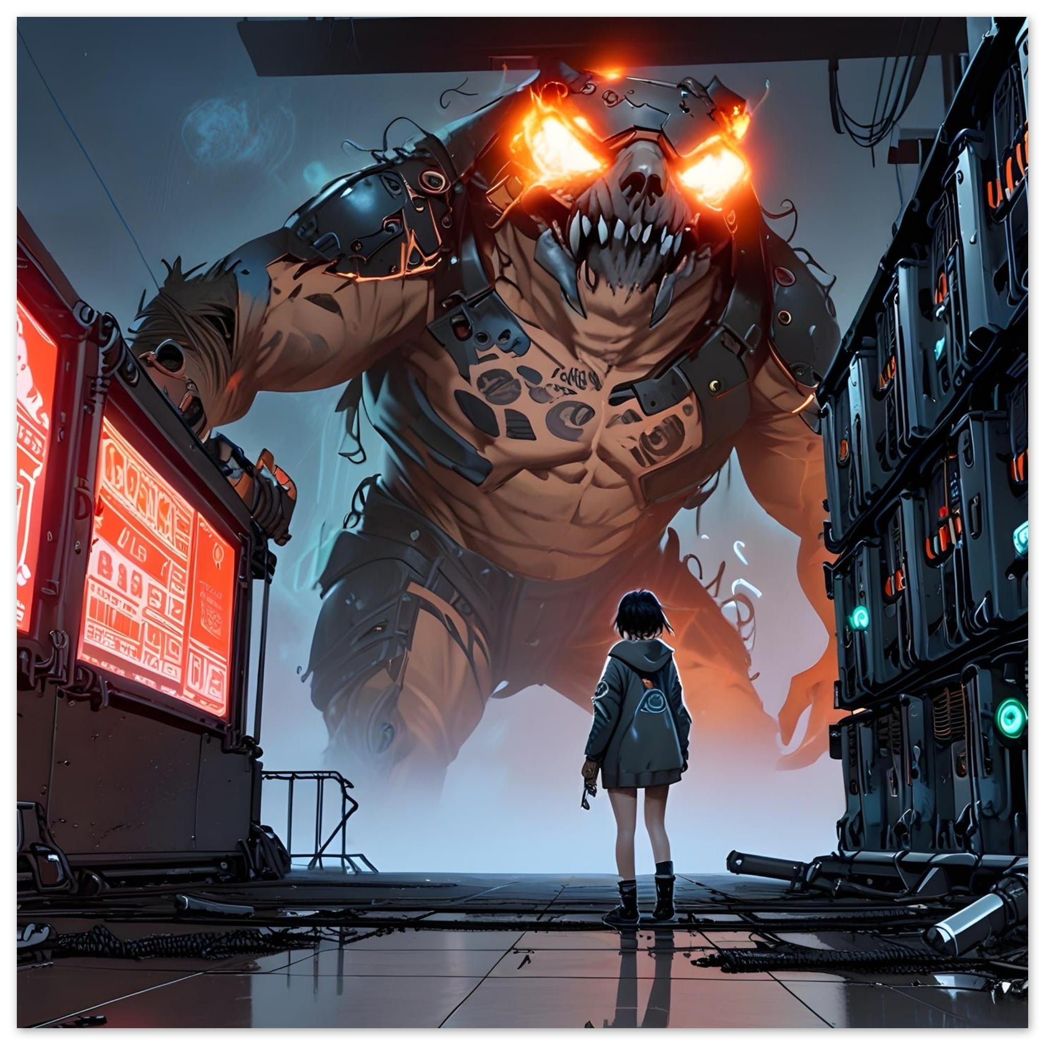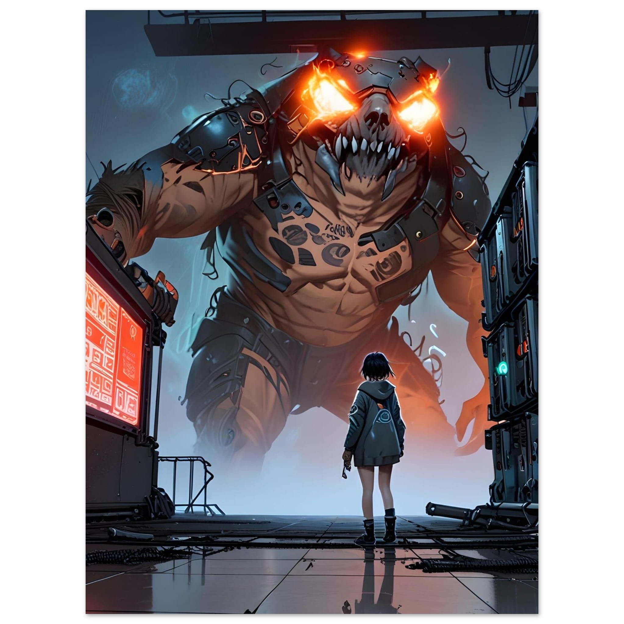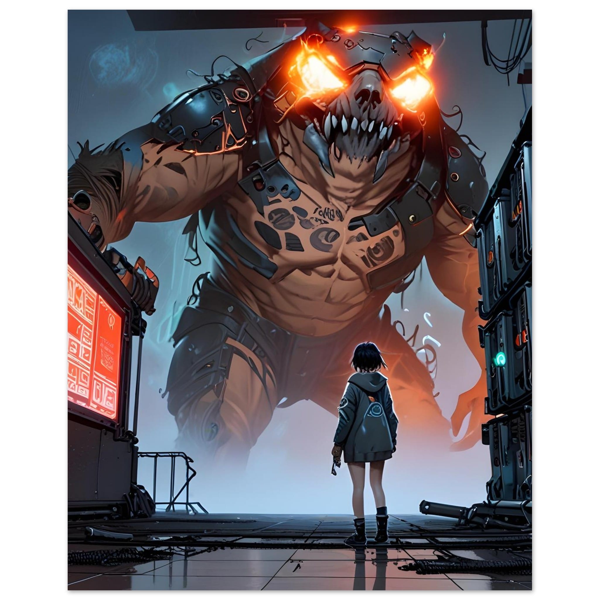 “Colossus Confrontation” is a jaw-dropping digital art print that immortalizes an epic battle between human courage and monstrous might. This high-resolution artwork depicts a lone warrior standing defiant against a towering biomechanical colossus—its armored limbs crackling with power and glowing orange eyes piercing the darkness. Set in a gritty industrial wasteland, the scene thrums with tension, perfect for sci-fi, fantasy, and dark futuristic aesthetics.